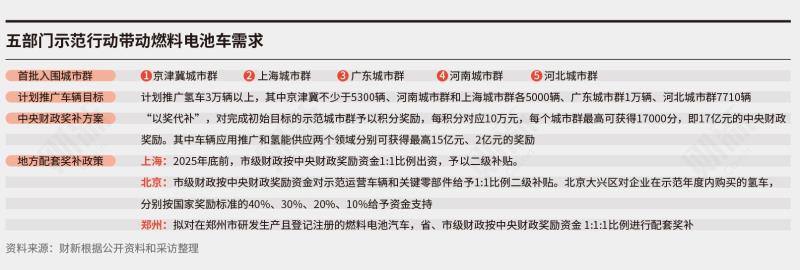 2020年9月,財政部等五部門發(fā)起燃料電池示范應(yīng)用行動(下稱“五部門示范行動”),京津冀、上海、廣東、河南、河北等五個城市群入圍首批試點,主要完成擴大車輛規(guī)模、攻克燃料電池核心技術(shù)、提升全產(chǎn)業(yè)鏈經(jīng)濟性、完善相關(guān)政策法規(guī)等任務(wù)。對于完成初始目標的示范城市群,中央財政予以事后獎勵,每個城市群最多可獲得17億元的財政獎勵。