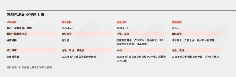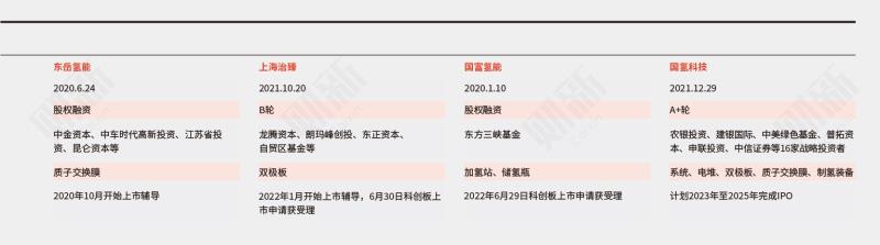 捷氫科技并非特例。目前,重塑科技、東岳氫能、國富氫能、上海治臻、國鴻氫能等氫能源電池廠商都完成了數(shù)輪融資,明確提出了上市計劃,各家背后都有不同城市集群的政策扶持以及數(shù)十家各類投資機構(gòu)。