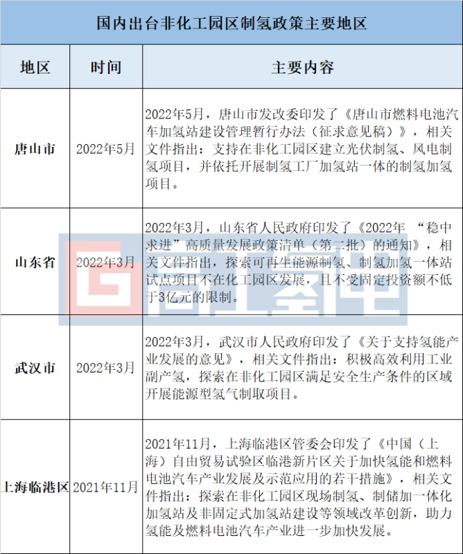 從相關(guān)政策內(nèi)容來看,山東省、上海臨港區(qū)和武漢市均為探索非化工園區(qū)制氫項(xiàng)目,而唐山市的政策則是明確(唐山市為征求意見稿)支持,態(tài)度更為積極。