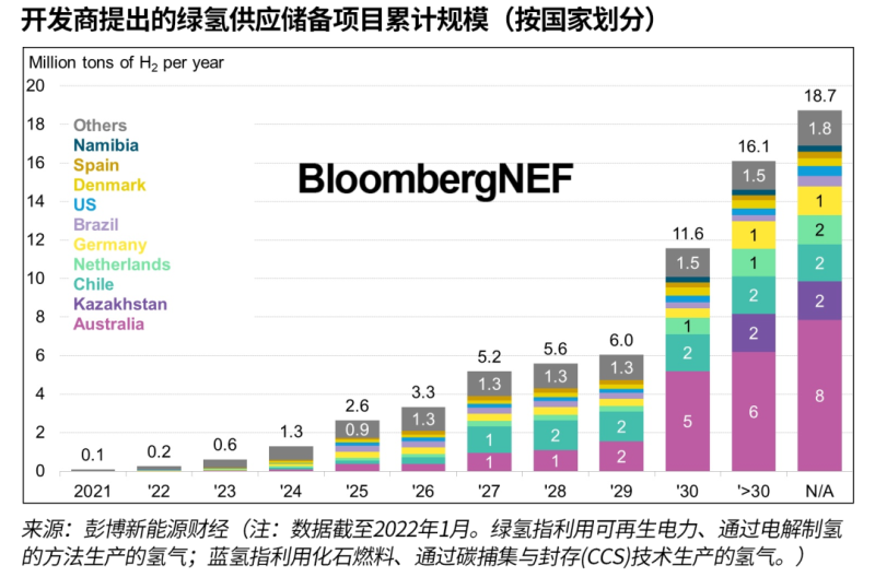 澳大利亞擁有豐富的可再生能源和化石燃料資源。根據(jù)彭博新能源財經(jīng)統(tǒng)計,相關(guān)公司正利用上述優(yōu)勢,提出年產(chǎn)能可能達到780萬噸的綠氫項目。藍氫項目可能會使該年產(chǎn)能進一步增加70萬噸。