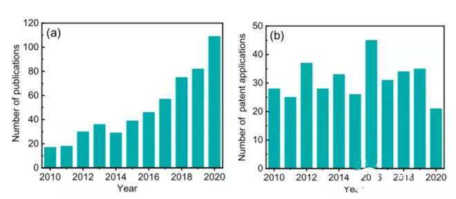 圖1:(a) 每年檢索“海水分解”題目時,摘錄的出版物數(shù)目;(b)在Patsnap數(shù)據(jù)庫中搜索標(biāo)題、摘要或權(quán)利要求中“海水”和“電解”等主題時,每年在Patsnap數(shù)據(jù)庫中發(fā)現(xiàn)的專利申請數(shù)量。