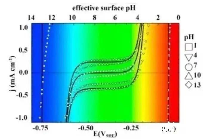 具體來說,隨著電解電流密度的增加,電極表面局部酸堿度會急劇變化(圖3:在H?飽和、無緩沖的pH1~13溶液中,通過循環(huán)伏安法獲得的電流密度-表面酸堿度關(guān)系),因此可能導(dǎo)致Ca(OH)?和Mg(OH)?沉淀的形成,并阻塞陰極活性位點。