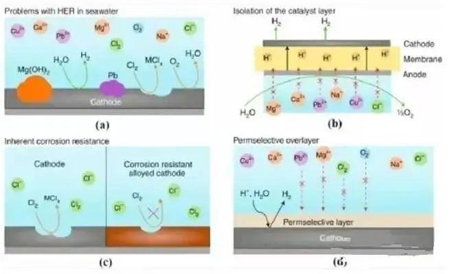 這些電解槽直接用來電解海水時,海水復(fù)雜的天然成分會對電解產(chǎn)生影響。其中主要問題是離子交換膜的物理或化學(xué)堵塞和金屬組件的腐蝕,例如海水中的Na?,Mg2? 和Ca2?離子會降低HTWE和PEMWE質(zhì)子交換膜的性能;