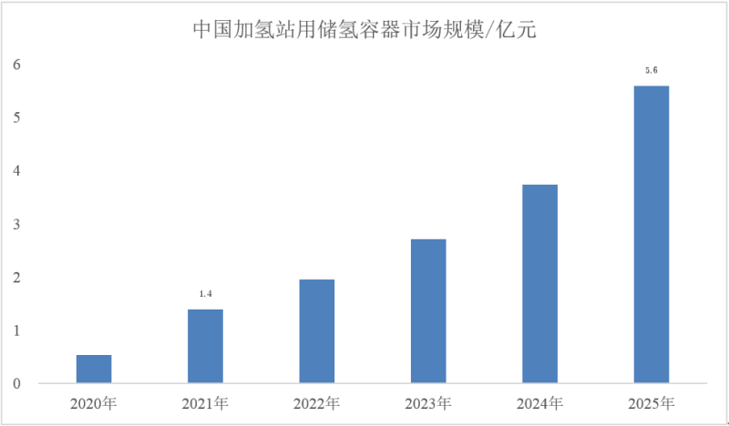 高工產(chǎn)研氫電研究所(GGII)《2022年中國加氫站市場調(diào)研報告》顯示,2021年中國加氫站用儲氫容器市場規(guī)模約為1.4億元,同比增長159%;到2025年,這一市場規(guī)模有望達到5.6億元。目前中集安瑞科和浙江藍能是兩大主流供應商,現(xiàn)在中材科技、東方鍋爐、國富氫能等也已公開宣布入局,站用儲氫容器這一賽道將更加熱鬧。