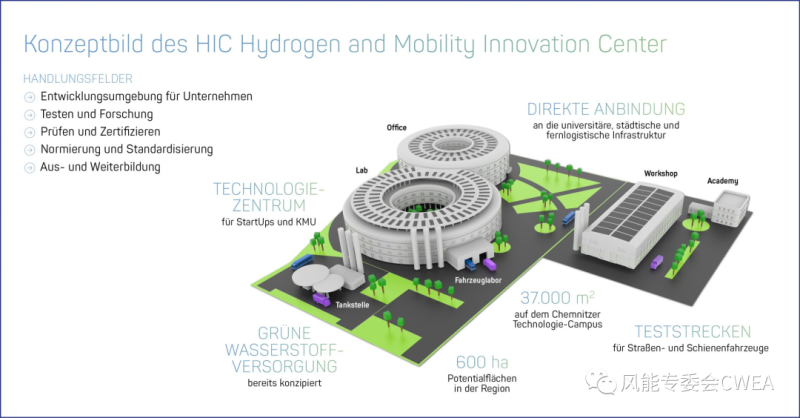 德國(guó)氫能和機(jī)動(dòng)創(chuàng)新中心設(shè)計(jì)圖。HIC的目標(biāo)是建立最先進(jìn)的汽車實(shí)驗(yàn)室、廣泛的氫認(rèn)證、燃料電池測(cè)試臺(tái)、培訓(xùn)中心和體驗(yàn)實(shí)驗(yàn)室。通過這種方式,氫的研究和轉(zhuǎn)移將提升到國(guó)際水平,并為全球市場(chǎng)成功創(chuàng)造先決條件。