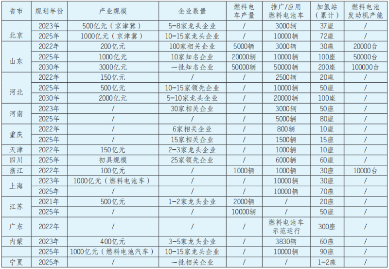 從主要省市區(qū)氫能產業(yè)發(fā)展規(guī)劃所制定的目標可以清晰地看出,燃料電池汽車及其產業(yè)鏈是各地發(fā)展氫能的主因,甚至是唯一選擇。表1中列舉的13個省市自治區(qū)中,除了寧夏以外,其余省市自治區(qū)的氫能產業(yè)規(guī)劃都具體為氫燃料電池汽車的生產或推廣目標,其中還有兩個?。ㄉ綎|和浙江)規(guī)劃了氫燃料電池發(fā)動機產能目標。對于氫能在其他領域的應用則沒有涉及。