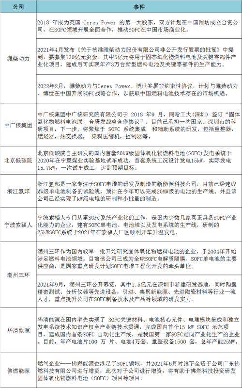 近兩年,國(guó)家能源結(jié)構(gòu)向綠色低碳轉(zhuǎn)型,SOFC因?yàn)榭梢宰鳛樾履茉窗l(fā)電調(diào)峰的主力軍在國(guó)內(nèi)開始備受關(guān)注,布局企業(yè)顯著增多(具體如下圖),代表企業(yè)有濰柴動(dòng)力、中廣核集團(tuán)、北京低碳院、浙江氫邦、寧波索福人、潮州三環(huán)、華清能源、佛燃能源等。