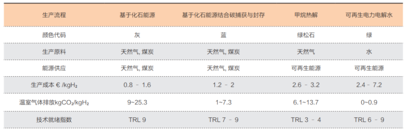 近年來,人們普遍使用所謂的氫配色方法來區(qū)分所使用的原料和能量載體。技術(shù)就緒指數(shù)TRL是在航天領(lǐng)域發(fā)展起來的對(duì)技術(shù)成熟程度評(píng)價(jià)的方法。指數(shù)為1表示新技術(shù)的開發(fā)水平非常低,僅有基本的工作原理。指數(shù)為9則表示技術(shù)已完全成熟,并具有在工業(yè)應(yīng)用和可靠性方面的良好記錄。下表用上述指標(biāo)概述了最常見的制氫技術(shù):