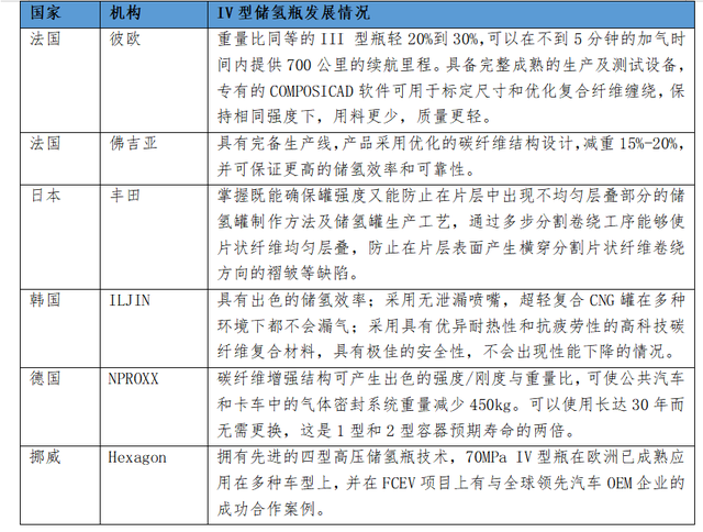法規(guī)、標準體系不健全,是國內(nèi)IV型儲氫瓶推廣不力的深層原因。盡管《車用壓縮氫氣塑料內(nèi)膽碳纖維全纏繞氣瓶》團體標準已正式實施,但產(chǎn)品及技術(shù)檢測、評價等諸多環(huán)節(jié)都缺乏相應的細致標準,如密封材料能否達到氣瓶的生命周期要求標準。同時中國IV型儲氫瓶的商業(yè)準入及產(chǎn)品認證放開較為緩慢,很多廠商目前沒有實質(zhì)性的訂單,只是在做前期的市場鋪墊工作,對于IV型儲氫瓶推廣應用不利。與部分國家相比,中國IV型儲氫瓶產(chǎn)業(yè)布局相對滯后。挪威、日本、法國的多家公司已經(jīng)做到IV型儲氫瓶的批量生產(chǎn),并應用于各種車型(見下表)。中國企業(yè)已經(jīng)開始紛紛布局IV型儲氫瓶的研發(fā)生產(chǎn),雖然已經(jīng)有沈陽斯林達獲得了制造許可,但整體而言,在IV型儲氫瓶生產(chǎn)及實際應用、關(guān)鍵技術(shù)和材料的研發(fā)、標準認證等方面,相對滯后。表 部分企業(yè)IV型儲氫瓶發(fā)展情況