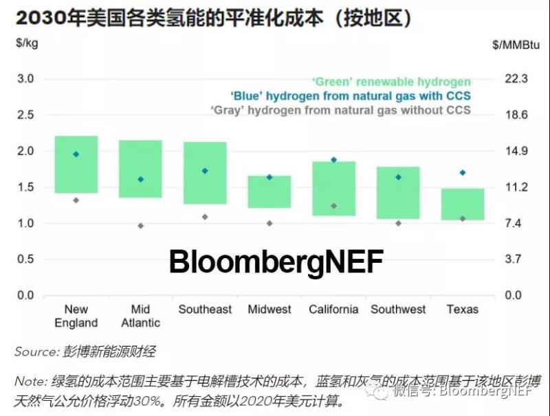 到2030年,美國綠氫的生產(chǎn)成本將接近1美元/千克。由于可再生能源和相關(guān)設(shè)備的成本下降,到2030年,清潔電力制綠氫的平準(zhǔn)化成本將低于用碳捕集與封存技術(shù)以天然氣制藍(lán)氫。生產(chǎn)綠氫的最低成本將出現(xiàn)在可再生能源電力最便宜的地區(qū),比如得克薩斯州和美國西南部。