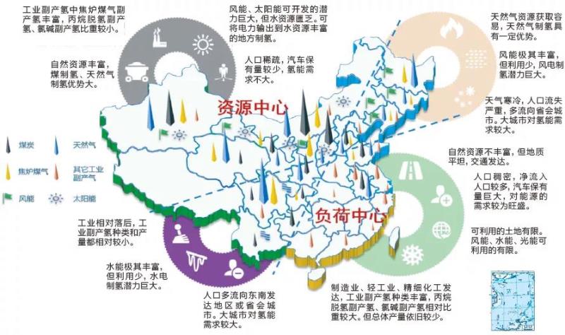 但是中國風(fēng)資源、光資源和水電資源分布都呈現(xiàn)出極強(qiáng)的地域特征。西北地區(qū)風(fēng)光資源豐富且開發(fā)潛力巨大,但水資源相對較少。西南地區(qū)水資源和水電資源都十分豐富,看起來適合發(fā)展電解水。但西南地區(qū)經(jīng)濟(jì)發(fā)展程度較低,人口密度相對較少。缺乏廣泛的氫能應(yīng)用市場。東南沿海地區(qū)海上風(fēng)電資源、水源充足,并且工業(yè)門類齊全、城市密集,同時具備綠氫的制造和應(yīng)用潛力。