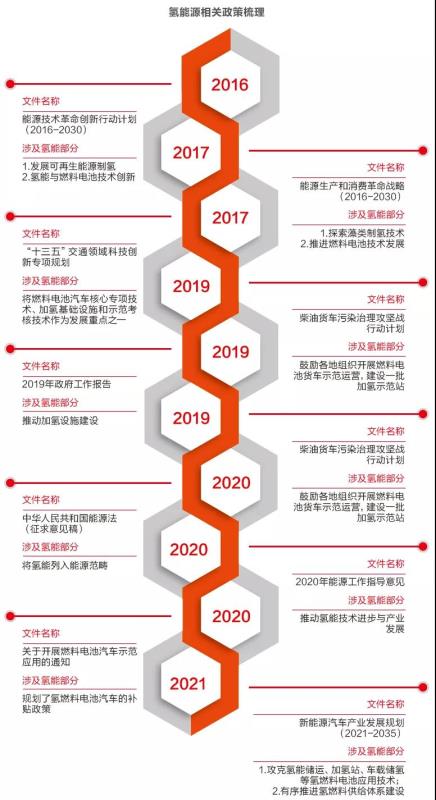 從“十三五”時期開始,氫能在國內(nèi)的發(fā)展開始逐漸有了商業(yè)化的突破。產(chǎn)業(yè)鏈開始初具雛形,這側(cè)面反映在國家政策對于氫能的支持力度開始增大。