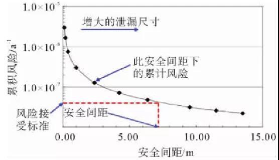 安全間距并不是針對大的災難性事故來保護系統(tǒng),而是應該覆蓋設施生命周期內可能發(fā)生的事故,尤其是發(fā)生概率較高的小尺寸泄漏事故,需要保證在超出安全間距區(qū)域泄漏事故引發(fā)的風險后果是可以接受的。