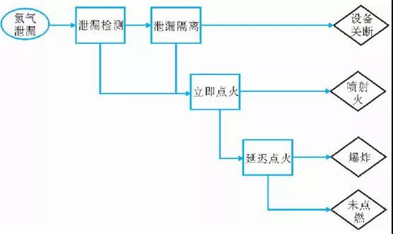 氫氣引發(fā)火災爆炸事故的原因有設計缺陷、設備老化、操作失誤、自然災害等,但大多數(shù)事故的直接原因為氫氣的泄漏。根據(jù)點火條件的不同,造成的事故后果主要有設備關停、噴射火、爆炸、空氣中消散等,建立事故樹,見圖1。