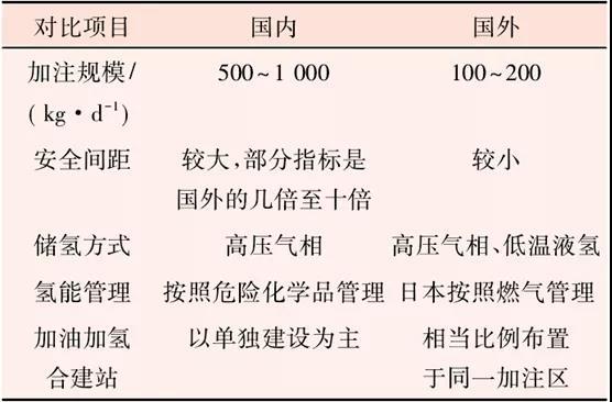 在對美國、德國、日本等國家和地區(qū)加氫站現(xiàn)狀分析的基礎上,從加注規(guī)模、安全間距、儲氫方式等多個方面與我國的加氫站進行了綜合比較。
