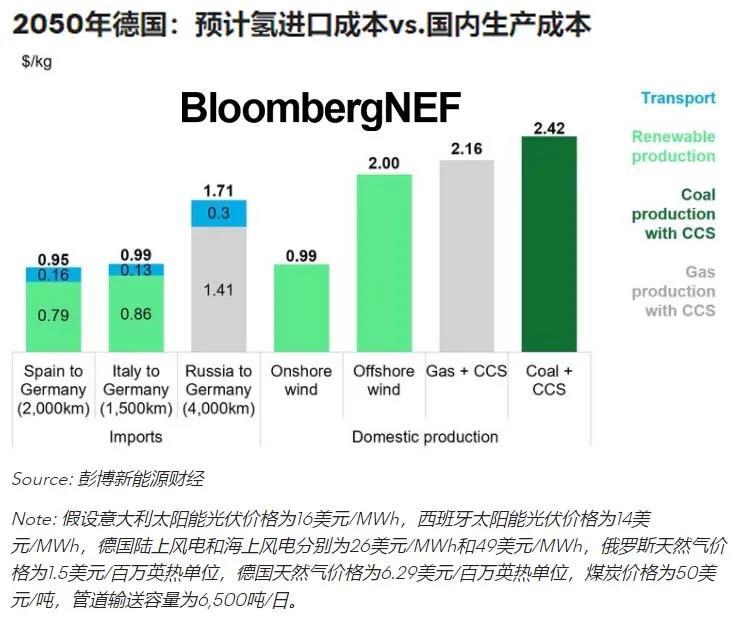 德國對氫氣管道的關(guān)注符合該國的氫戰(zhàn)略。為了實現(xiàn)氣候目標,該國2030年的低碳氫需求必須達到90至110TWh,即230至280萬噸。由于對本土可再生能源生產(chǎn)的擔(dān)憂較盛,德國氫戰(zhàn)略的實現(xiàn)將較大程度依賴氫氣進口。在此背景下,通過管道將進口氫氣輸送至各個需求點,對德國氫戰(zhàn)略的成功實施至關(guān)重要。根據(jù)彭博新能源財經(jīng)的分析,管道也是長距離、大規(guī)模氫氣運輸?shù)淖盍畠r方式。比方說,到2050年,從意大利和西班牙進口的氫氣將與德國國內(nèi)生產(chǎn)的綠色氫氣價格持平,甚至更低。