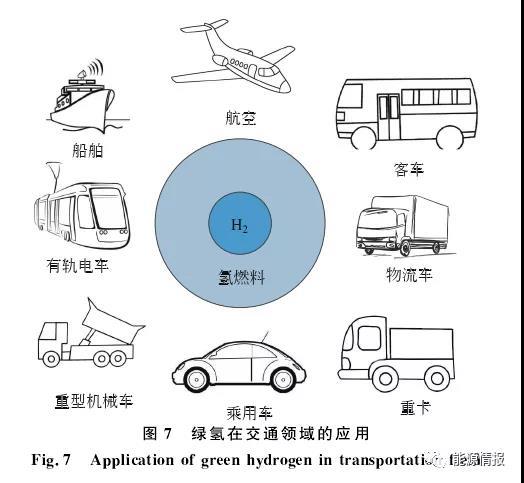 與純電動汽車相比,氫燃料電池汽車的燃料加注時間短、續(xù)航里程長,隨著綠色氫能技術的進步和產(chǎn)業(yè)規(guī)?;l(fā)展帶來的成本的下降,綠氫將在交通運輸領域有更廣泛的應用,如圖7所示。