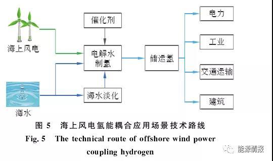 近年來,我國陸上風電的技術日趨成熟,風電發(fā)展逐漸向海上風電傾斜。為了實現(xiàn)碳中和背景下風電裝機容量新目標,豐富的海上風電資源的開發(fā)利用是必然趨勢。海上風電與氫能耦合可以提高海洋能源的綜合利用效率,為海上風電消納與輸送提供新的思路,海上風電與氫能耦合應用場景技術路線如圖5所示。海上風電與氫能耦合有2條技術路線,海水淡化分解制氫和咸水直接制氫。海水淡化分解制氫技術相對成熟,但海水淡化增加了制氫的成本;咸水直接電解制氫需要關鍵材料和催化劑,技術仍待突破。