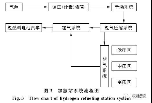 加氫站是氫能商業(yè)化推廣應用的基礎設施。氫能的加注技術是將不同來源的氫氣通過壓縮機增壓儲存在站內的高壓罐內,再通過加氣機為氫燃料電池汽車加注氫氣的過程。加氫站系統(tǒng)流程圖如圖3所示。