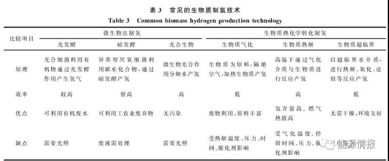 生物質制氫技術是一種高效無污染的生物工程技術,原料豐富、工作環(huán)境簡單、生產(chǎn)費用低、可再生、低消耗,是未來規(guī)模化制氫的重要途徑。生物質制氫技術目前主要有微生物法和熱化學轉化法。微生物法制氫技術包括光發(fā)酵法制氫、暗發(fā)酵法制氫和光合生物制氫。熱化學轉化法制氫技術包括生物質氣化法制氫、生物質熱解法制氫、生物質超臨界法制氫。常見的生物質制氫技術如表3所示。