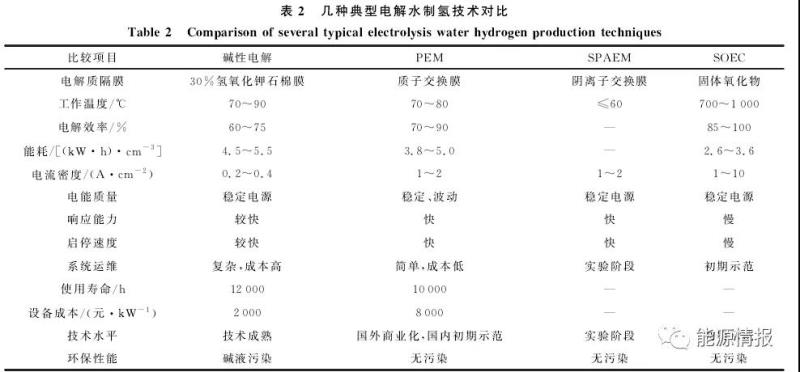 根據(jù)電解質種類不同,典型的電解水制氫技術主要分為以下幾類:堿性電解、質子交換膜電解(protonex change membrane,PEM)、固體聚合物陰離子交換膜電解(solid polymer anion exchange membrane,SPAEM)、固體氧化電解(solid oxide electrolyze cells,SOEC)。幾種不同的電解水制氫技術特點如表2所示。