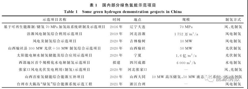 2019年3月,氫能首次被寫入我國《政府工作報告》,并先后出臺多個配套規(guī)劃和政策,推動氫能研發(fā)、制備、儲運和應用鏈條不斷完善。2020年9月,四部委聯(lián)合發(fā)布《關于擴大戰(zhàn)略性新興產(chǎn)業(yè)投資培育壯大新增長點增長極的指導意見》,加快新能源發(fā)展,加快制氫加氫設施建設。2020年12月,《新時代的中國能源發(fā)展》白皮書指出,支持新技術新模式新業(yè)態(tài)發(fā)展,加速發(fā)展綠氫制取、儲運和應用等氫能產(chǎn)業(yè)鏈技術裝備,促進氫能燃料電池技術鏈、氫燃料電池汽車產(chǎn)業(yè)鏈發(fā)展。2021年2月22日,國務院發(fā)布《關于加快建立健全綠色低碳循環(huán)發(fā)展經(jīng)濟體系的指導意見》指出,大力發(fā)展氫能,加大加氫等配套設施建設。隨著氫能政策的制定與完善,大批的氫能示范項目也陸續(xù)開展,部分綠色氫能示范項目如表1所示。