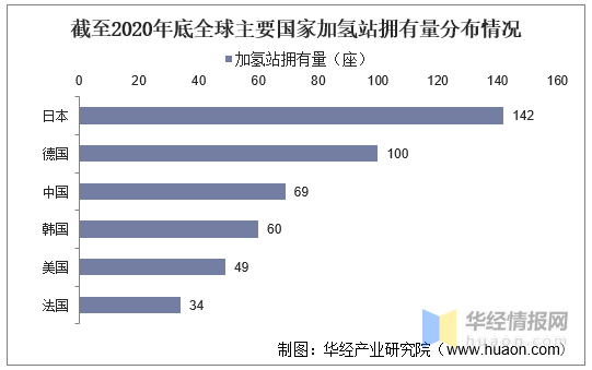 從國家角度看,2020年,全球加氫站擁有量排名第一的國家是日本,為142座;德國排名第二,加氫站數(shù)量為100座;中國以69座加氫站擁有量位居全球第三。