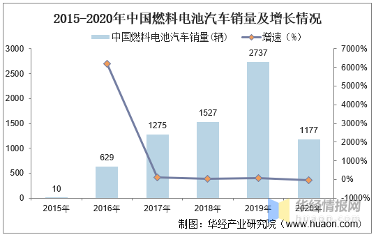 據(jù)中國汽車協(xié)會數(shù)據(jù)顯示,2015年,中國燃料電池汽車銷量僅10輛,在補貼政策的帶動下,2019年銷量達2737輛,同比增長79.24%;2020年受疫情影響全年銷量僅1177輛,同比下滑57%。