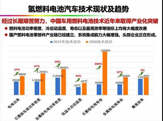 數(shù)據(jù)統(tǒng)計(jì)顯示,現(xiàn)在的性能跟五年前相比,所有主要的性能指標(biāo)都有大幅的提升,比如核心指標(biāo)燃料電池壽命提升了300%。國(guó)產(chǎn)燃料電池零部件的產(chǎn)業(yè)鏈已經(jīng)建立,系統(tǒng)集成能力大幅增強(qiáng),頭部企業(yè)正在形成。
