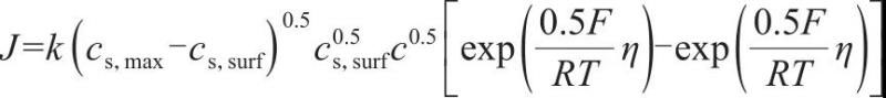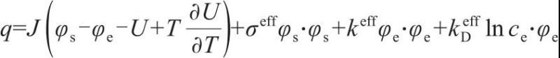 式中,φs、φe分別為固相以及液相中的電勢;σeff為固相顆粒的電導(dǎo)率;keff為電化學(xué)反應(yīng)速率常數(shù);kDeff為液相離子電導(dǎo)率;ce為電解質(zhì)濃度;cs,max為固相中插入的鋰離子最大濃度;cs,surf為固相表面的鋰離子濃度;F為法拉第常數(shù);R為氣體常數(shù);η為電化學(xué)反應(yīng)超電勢。
