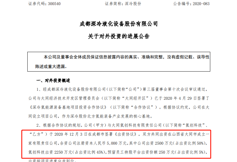根據(jù)合作協(xié)議的規(guī)劃,公司(甲方)與大同氫創(chuàng)科技有限責(zé)任公司(“氫創(chuàng)科技”、“乙方”)于2020年12月3日在成都市簽署《出資協(xié)議》,雙方共同出資在山西省大同市成立一家有限責(zé)任公司,公司名稱:山西深冷氫能科技發(fā)展有限公司(暫定名),合資公司注冊(cè)資本人民幣5000萬元,其中公司出資2500萬元(占出資比例50%),氫創(chuàng)科技出資2250萬元(占出資比例45%),預(yù)留員工持股平臺(tái)出資份額250萬元(占出資比例5%),出資按項(xiàng)目進(jìn)度分步到位。