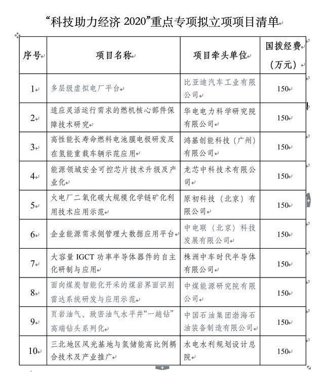 6月30日,國(guó)家能源局綜合司發(fā)布關(guān)于能源領(lǐng)域“科技助力經(jīng)濟(jì)2020”重點(diǎn)專(zhuān)項(xiàng)擬立項(xiàng)項(xiàng)目的公示,擬將多層級(jí)虛擬電廠(chǎng)平臺(tái)、適應(yīng)靈活運(yùn)行需求的燃機(jī)核心部件保障技術(shù)研究、高性能長(zhǎng)壽命燃料電池膜電極研發(fā)及在氫能重載車(chē)輛示范應(yīng)用等10個(gè)項(xiàng)目列入重點(diǎn)專(zhuān)項(xiàng),每個(gè)專(zhuān)項(xiàng)各將獲得國(guó)家撥款經(jīng)費(fèi)150萬(wàn)元。