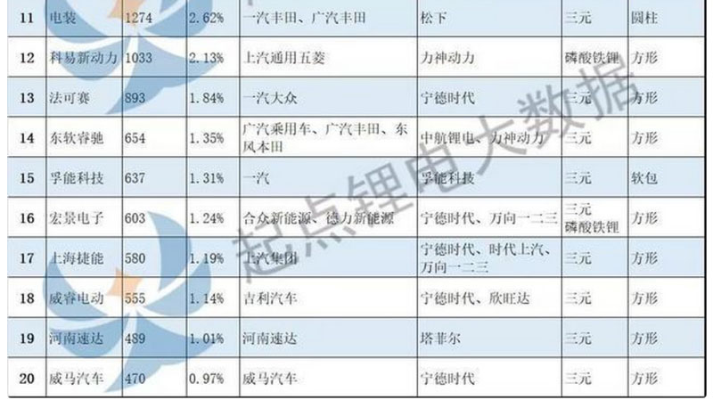 動力電池企業(yè)只占3家,但市占率合計達(dá)到31.96%。并且,排名第二的比亞迪計入車企而不計入動力電池企業(yè)。這3家電池企業(yè)分別是寧德時代(第1),國軒高科(第3)、孚能科技(第15)。