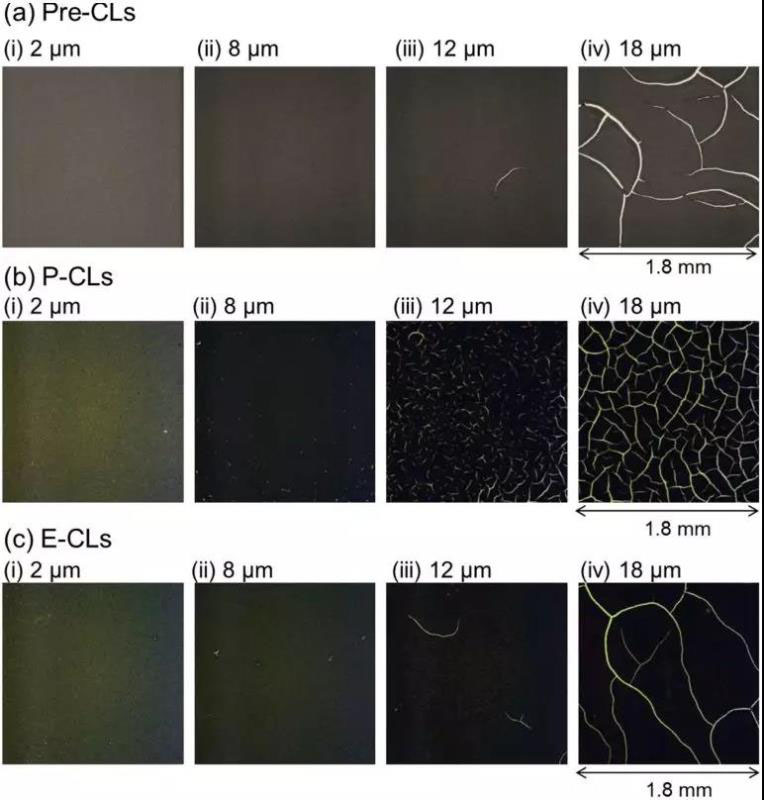 由于涂在PTFE基材上的催化劑層難以處理,無法進(jìn)行準(zhǔn)確的CCT測量(即使輕柔操作,PTFE基材也容易彎曲或變形,不可避免地會(huì)影響破裂條件)。為避免這些問題,該研究采用在剛性玻璃基板上涂覆的方法進(jìn)行CCT測量。對于2 um和8 um厚度Pre-CL催化層,沒有發(fā)現(xiàn)裂痕現(xiàn)象。12 um厚Pre-CLs催化層產(chǎn)生U形裂痕,該裂痕為primary cracks(裂痕分為PC(primary cracks)、SC(secondary cracks)和DC(cracks caused by critical defects))。18 um厚Pre-CLs催化層產(chǎn)生網(wǎng)格裂痕。