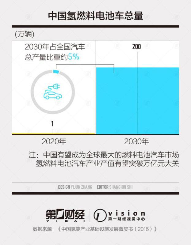 由中國標(biāo)準(zhǔn)化研究院和全國氫能標(biāo)準(zhǔn)化技術(shù)委員會聯(lián)合組織編著的《中國氫能產(chǎn)業(yè)基礎(chǔ)設(shè)施發(fā)展藍(lán)皮書(2016)》預(yù)計,到2020年,中國氫燃料電池車輛將達(dá)到1萬輛;到2030年,氫燃料電池車輛保有量將達(dá)到200萬輛,占全國汽車總產(chǎn)量的比重約5%,屆時,中國有望成為全球最大的燃料電池汽車市場,氫燃料電池汽車產(chǎn)業(yè)產(chǎn)值有望突破萬億元大關(guān)。