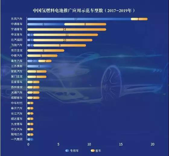而在已發(fā)布的2019年前5批目錄中,已有10家廠商發(fā)布的13個氫燃料電池汽車車型。