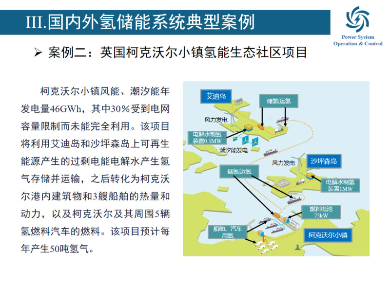 英國的柯克沃爾小鎮(zhèn)氫能生態(tài)社區(qū),因為它是在海邊,把棄風以及潮汐發(fā)電的電力來制氫,再通過燃料電池驅動汽車、船舶以及小鎮(zhèn)的供熱。