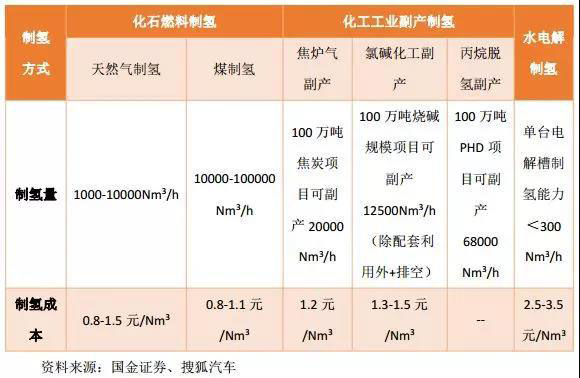 因此未來短時間內(nèi)我國氫能產(chǎn)業(yè)發(fā)展的氫源主要將來自化石燃料制氫(煤制氫)和化工工業(yè)副產(chǎn)氫(焦?fàn)t氣副產(chǎn)氫、氯堿副產(chǎn)、PDH即丙烷脫氫副產(chǎn)等)。下表為各種制氫方式的制氫規(guī)模以及成本。