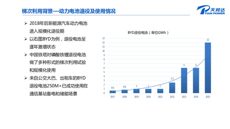 使用情況,重點是中國鐵塔,它從2015、2016年做了多種形式梯次利用的試驗,包括在通信基站有規(guī)?;纳逃?,也是以比亞迪為例,比亞迪應(yīng)該在2018年就交了超過250兆瓦時的梯次電池,應(yīng)用于鐵塔的通信基站中。