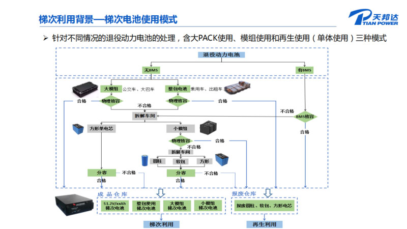 我們再看一下梯次電池使用的一些模式,因為主要還是我們結(jié)合中國鐵塔的一些使用模式來講,可能不是太全。中國鐵塔目前主要是推三種模式,也就是退役的汽車動力的Pack包,首先做一個物理核容,如果這個物理核容直接符合Pack去使用,后續(xù)就應(yīng)用于相關(guān)的一些直接Pack使用的應(yīng)用場景。如果核容是不滿足直接使用場景情況下會再做一些拆解,這里面有兩種情況,一種情況是這個Pack包本身由方形的大電池組成,所以直接對方形的電池包進行分容、配組,最后形成一個像通信基站可以直接使用的電池包直接使用,這種我們稱之為單體使用模式。還有一些廠家,比如像比亞迪的電池,它會采用模組化的方式,可能在它當初設(shè)計Pack的時候就考慮到將來的梯次利用方式。所以模組被拆下來的時候,經(jīng)過物理核容,如果直接能達到模組的使用要求,就進入到模組使用的模式。