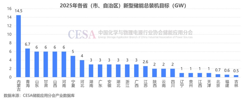 據(jù)CESA儲能應(yīng)用分會產(chǎn)業(yè)數(shù)據(jù)庫不完全統(tǒng)計的全國25個省(市、自治區(qū))2025年的新型儲能裝機(jī)目標(biāo)中山東、甘肅、山西、河南總裝機(jī)目標(biāo)均為6GW,并列全國第三。