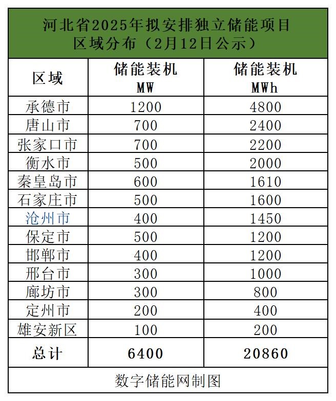 2月12日,河北省發(fā)改委發(fā)布《河北省2025年擬安排獨(dú)立儲(chǔ)能項(xiàng)目情況公示》,共公示獨(dú)立儲(chǔ)能項(xiàng)目37個(gè)、裝機(jī)容量6.4GW/20.86GWh。