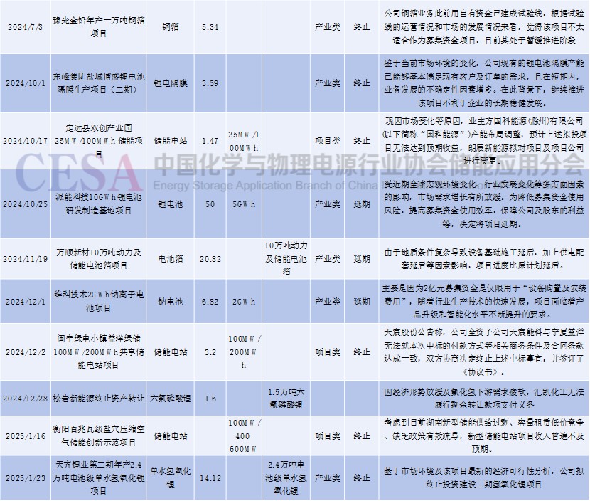 從終止或者延期原因來看,具體分為自身發(fā)展情況及戰(zhàn)略規(guī)劃調(diào)整、綜合評估其投資建設(shè)效益預(yù)測不及預(yù)期、考慮到當(dāng)?shù)匦滦蛢?chǔ)能市場供給情況、特殊施工因素影響幾大類別。