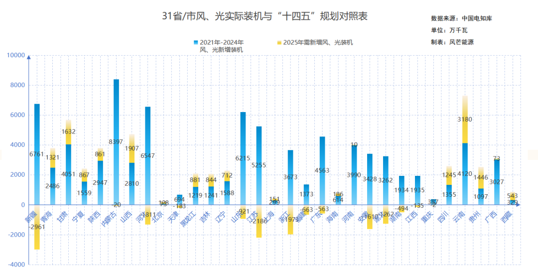 注:部分省份未明確“十四五”新增風(fēng)電裝機(jī)容量,故圖中未顯示2025年需新增風(fēng)電裝機(jī)數(shù)據(jù)