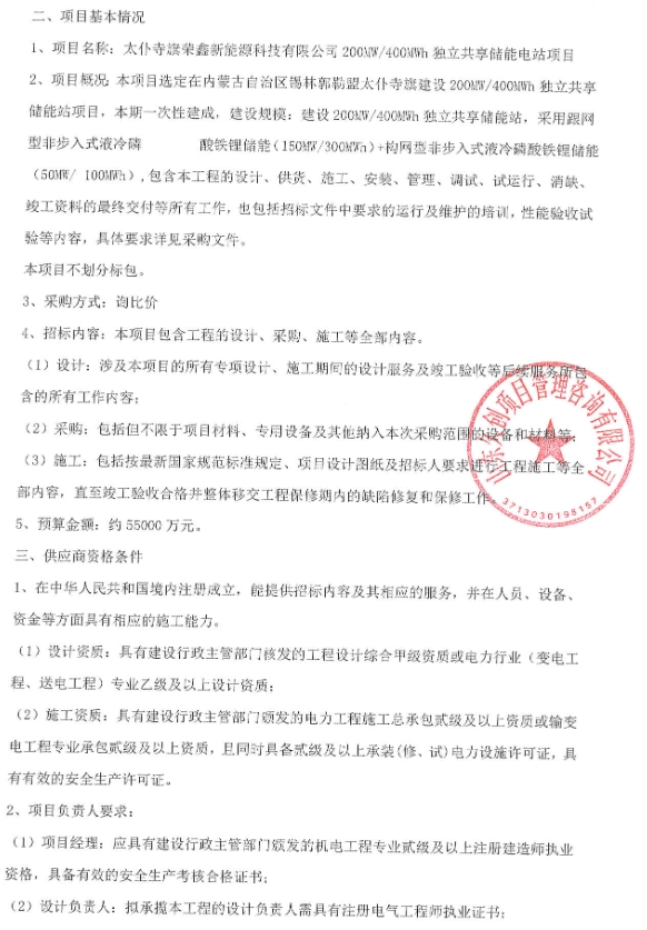 中國儲(chǔ)能網(wǎng)訊:2月19日,太仆寺旗榮鑫新能源科技有限公司200MW/400MWh獨(dú)立共享儲(chǔ)能電站項(xiàng)目EPC總承包詢比采購公告發(fā)布,本項(xiàng)目選定在內(nèi)蒙古自治區(qū)錫林郭勒盟太仆寺旗建設(shè),本期一次性建成,建設(shè)200MW/400MWh獨(dú)立共享儲(chǔ)能站,采用跟網(wǎng)型非步入式液冷磷酸鐵鋰儲(chǔ)能(150MW/300MWh)+構(gòu)網(wǎng)型非步入式液冷磷酸鐵鋰儲(chǔ)能(50MW/ 100MWh),包含本工程的設(shè)計(jì)、供貨、施工、安裝、管理、調(diào)試、試運(yùn)行、消缺、竣工資料的最終交付等所有工作,也包括招標(biāo)文件中要求的運(yùn)行及維護(hù)的培訓(xùn),性能驗(yàn)收試驗(yàn)等內(nèi)容。
