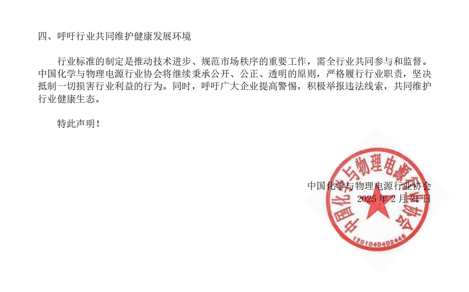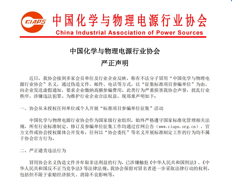 中國化學與物理電源行業(yè)協(xié)會嚴正聲明