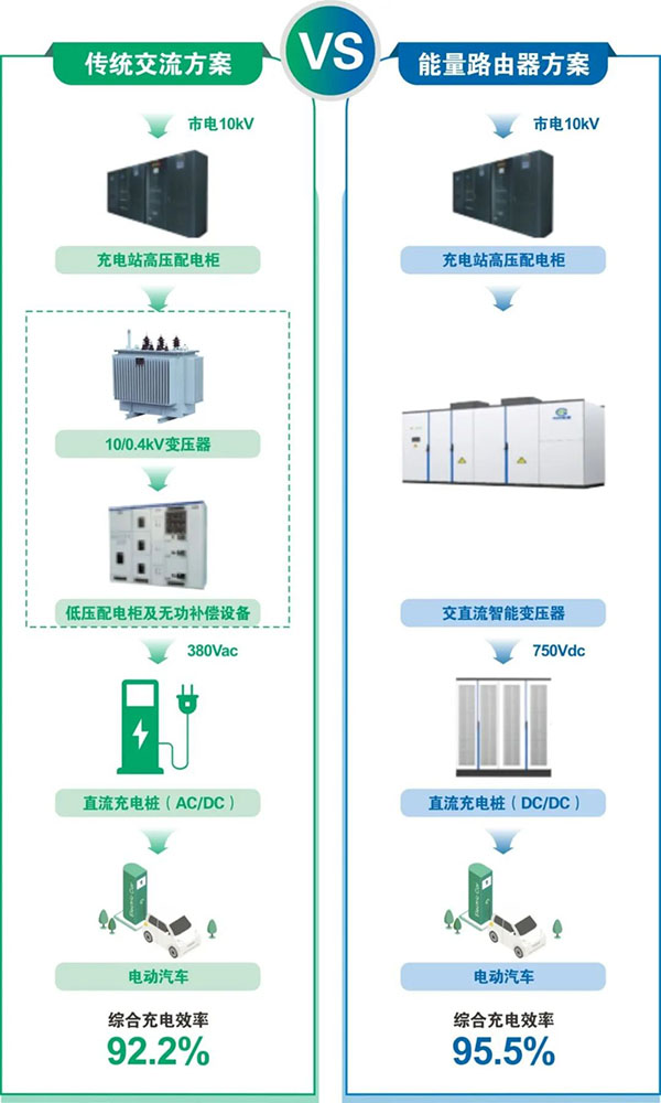 我們知道,一般常規(guī)充電場(chǎng)站采用的都是交流變壓器,將10千伏高壓交流電降壓至380伏交流電,再通過(guò)充電樁內(nèi)置轉(zhuǎn)換器將交流電轉(zhuǎn)為直流電為新能源汽車充電,這種“高壓交流→低壓交流→直流”的二級(jí)轉(zhuǎn)換過(guò)程中,每次電能轉(zhuǎn)換會(huì)產(chǎn)生3%-5%的能量損耗。