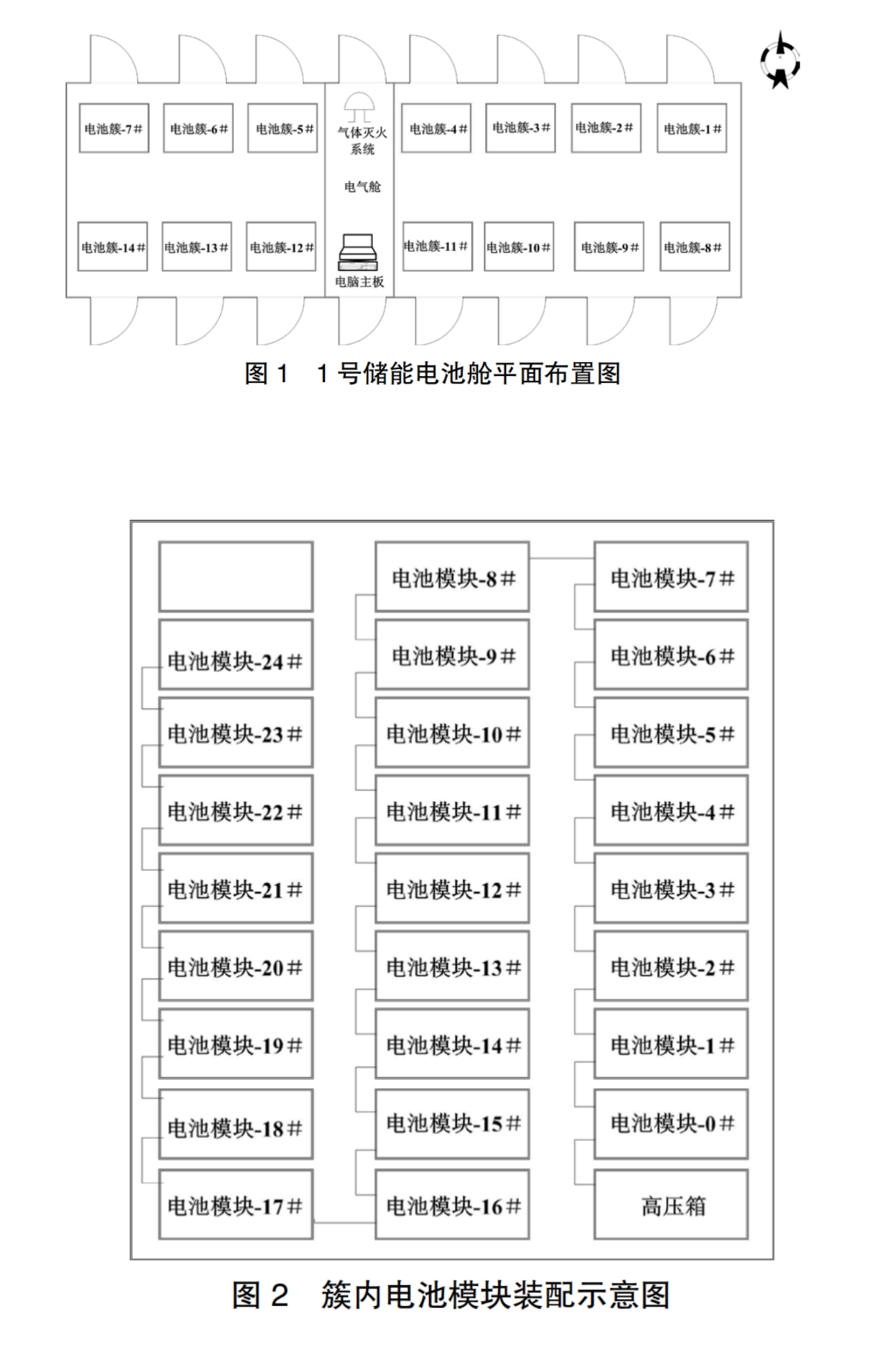 該儲(chǔ)能電站設(shè)有4座集裝箱式儲(chǔ)能電池艙及儲(chǔ)能升壓一體艙,由北向南依次布置,分別編號(hào)為1~4號(hào)。每座儲(chǔ)能電池艙長(zhǎng)13.7m、寬2.43m、高2.95m,南、北兩側(cè)共設(shè)有16個(gè)箱門,每個(gè)箱門對(duì)應(yīng)一簇電池組,其中北側(cè)由東向西設(shè)有1~7簇電池組,南側(cè)由東向西設(shè)有8~14簇電池組;中間部位設(shè)有電氣艙,電氣艙內(nèi)北側(cè)為氣體滅火系統(tǒng)、南側(cè)為電腦主機(jī)裝置(見圖 1)。每簇電池組內(nèi)裝配有25個(gè)電池模塊(見圖2),每個(gè)電池模塊又包括16個(gè)磷酸鐵鋰電池芯,該磷酸鐵鋰電池芯型號(hào)為BQ280-16S、容量280Ah、額定電壓3.2V、滿電電壓3.65V,上述每簇電池組內(nèi)25個(gè)電池模塊之間、每個(gè)電池模塊16個(gè)電池芯之間均為串聯(lián),簇與簇之間為并聯(lián)。此次起火艙室為1號(hào)儲(chǔ)能電池艙。