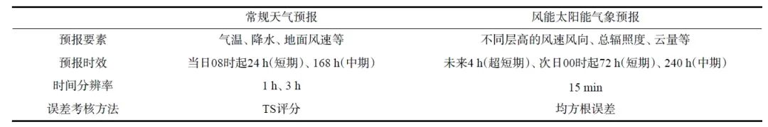 下表對比了風(fēng)能太陽能氣象預(yù)報與常規(guī)天氣預(yù)報的差異,從下表可以看出,無論是預(yù)報要素、預(yù)報時效,還是時間分辨率、誤差考核方法,兩者之間都有明顯差異,風(fēng)能太陽能氣象預(yù)報的要求遠(yuǎn)高于常規(guī)天氣預(yù)報,這也為新能源氣象預(yù)報服務(wù)帶來了極大挑戰(zhàn)。