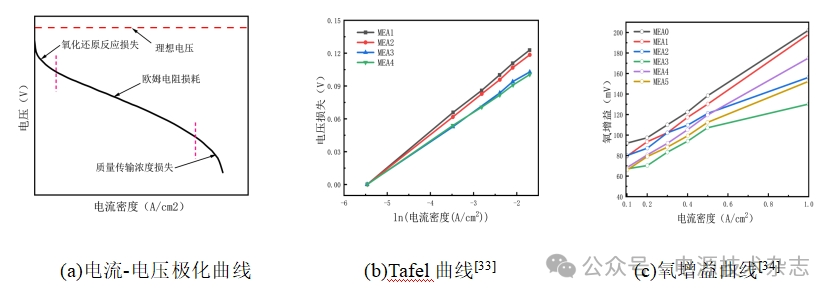 MEA的性能可以通過(guò)極化曲線進(jìn)行分析。為了獲得最佳性能,需要優(yōu)化各種操作條件,操作條件有陰陽(yáng)極氣體計(jì)量比、運(yùn)行溫度、壓力、濕度等。膜電極的性能取決于上述的運(yùn)行條件,調(diào)節(jié)陰陽(yáng)極氣體的計(jì)量比,在適宜的溫度和濕度下獲得最佳的表現(xiàn)性能[28-30],運(yùn)行工況表現(xiàn)較大差異,如美國(guó)DOE測(cè)試規(guī)程[2]中電池溫度80 ℃,氫空計(jì)量比1.5∶1.8,出口背壓50 kPa,RH為100%,電流密度每增加200 mA/cm2恒電流放電3 min。極化曲線大致分為三個(gè)區(qū)域,如圖2(a)所示,分別為低電流區(qū)、中電流區(qū)和高電流區(qū)。由于開(kāi)路極化的存在,開(kāi)路電壓低于理想電壓;低電流區(qū)主要反映活化極化損失,主要受反應(yīng)速率較慢的陰極氧還原反應(yīng)影響;中電流區(qū)主要反映燃料電池歐姆極化;高電流區(qū)域則反映傳質(zhì)極化,主要是由于反應(yīng)界面上氣體傳質(zhì)速度已不能滿足反應(yīng)需求[31-32]。催化劑活性與O2傳輸阻力的變化也可以通過(guò)特定的極化曲線測(cè)試獲取。催化劑的活性可通過(guò)測(cè)試低電流密度區(qū)間的極化曲線,使用Tafel曲線分析法[33]獲取。在極化曲線的低電流密度區(qū)域(100 mA/cm2以下),MEA的性能主要受催化劑活性、反應(yīng)位點(diǎn)、溫度等化學(xué)反應(yīng)動(dòng)力學(xué)相關(guān)因素影響,電壓損失與電流密度近似為對(duì)數(shù)關(guān)系,可以由簡(jiǎn)化的Butler-Volmer方程繪制Tafel曲線,如圖2(b)所示,Tafel斜率越小,反應(yīng)動(dòng)力學(xué)速率更高,說(shuō)明催化劑活性越好。MEA內(nèi)O2傳輸阻力可以通過(guò)測(cè)試氫氧極化曲線分析氧增益[34]。測(cè)試時(shí),陰陽(yáng)極分別通入干燥的O2和H2,其他操作條件(流量計(jì)量比、溫度、壓力、測(cè)試步長(zhǎng)等)與極化曲線(測(cè)試時(shí)通入干燥的空氣和H2)相同,得到氫氧下的I-V曲線。氫氧下獲得的I-V曲線與氫空下獲得的I-V曲線的差值為氧增益曲線,如圖2(c)所示。O2傳輸阻力大小與氧增益電壓成正比,CL孔通道較少時(shí),催化層親水性降低,到達(dá)CL內(nèi)側(cè)的O2較少,氧增益電壓較大。通過(guò)分析耐久前后相同電流密度下的氧增益電壓可用來(lái)表征MEA內(nèi)O2傳輸阻力的變化。